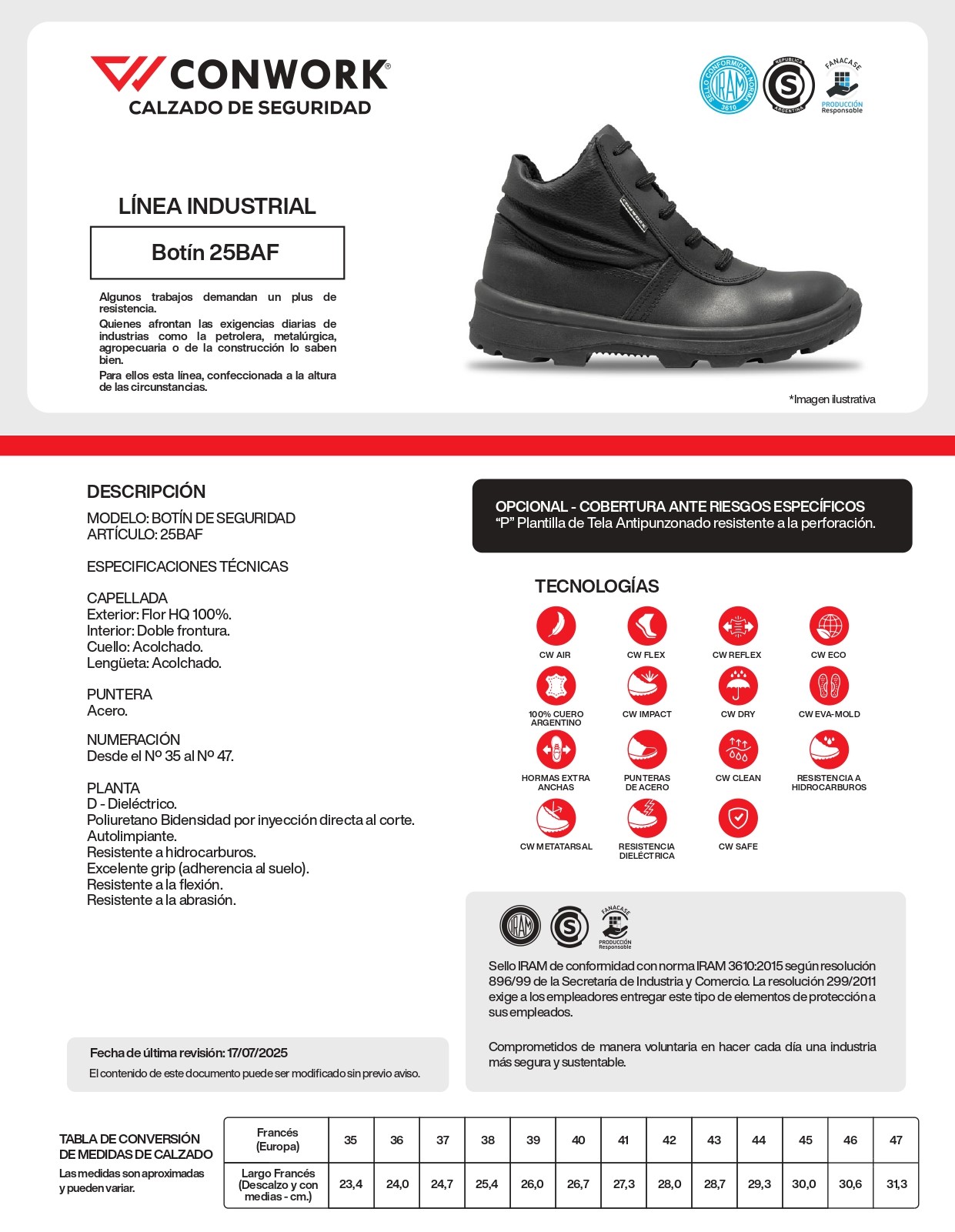 El botín de seguridad 25BAF está diseñado para brindar máxima protección y resistencia en entornos laborales exigentes. Pertenece a la línea industrial y cuenta con capellada en cuero flor HQ 100%, asegurando durabilidad y alto rendimiento.